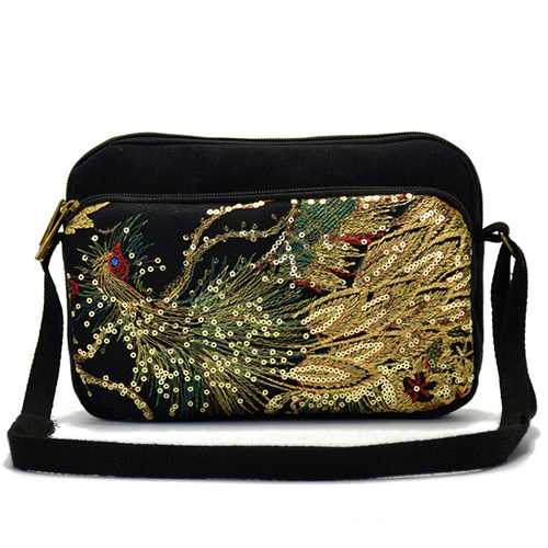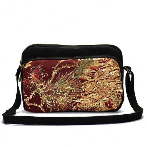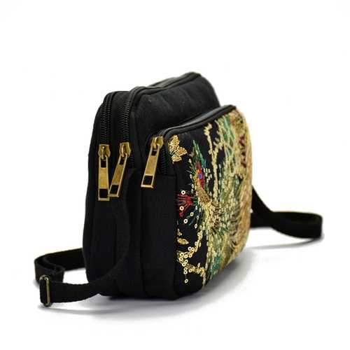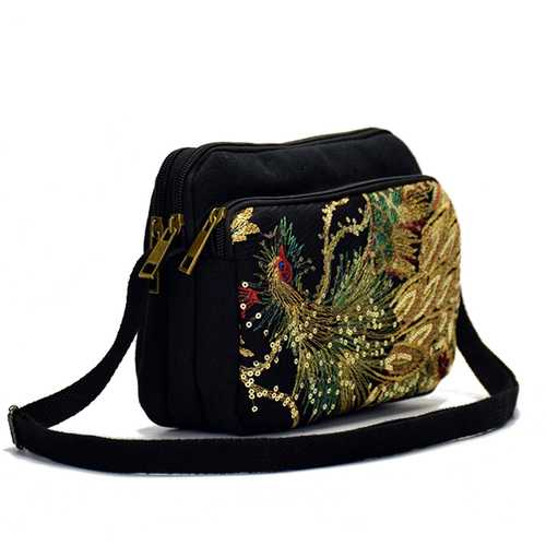 Women National Embroider Peacock Canvas Sling Bag Shoulder Crossbody Bag